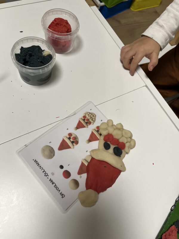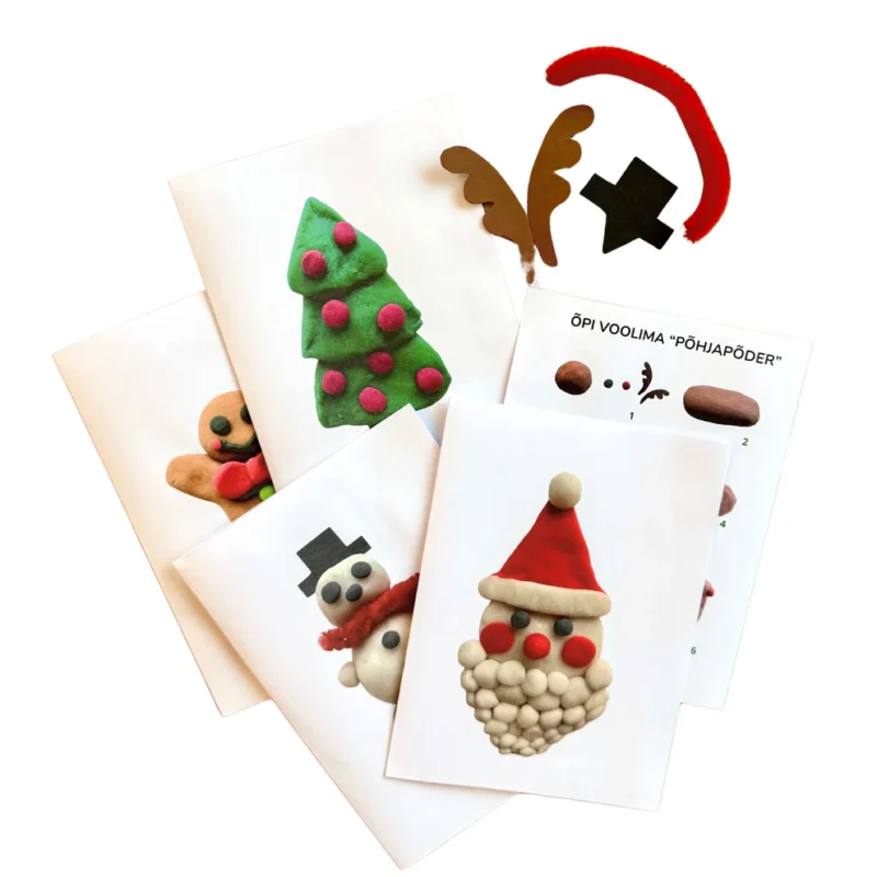 Komplektis on 5 vastupidavat, lamineeritud õppekaarti, mis juhendavad last samm-sammult voolima jõuluvana, põhjapõtra, piparkoogimeest, lumememme ja kuusepuud.