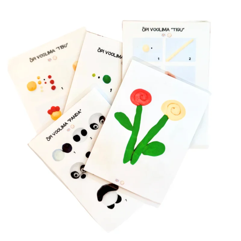 Komplektis on 5 vastupidavat, lamineeritud õppekaarti, mis juhendavad last samm-sammult voolima tigu, tibu, lille, pandat ja dinosaurust.