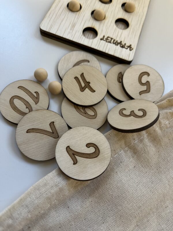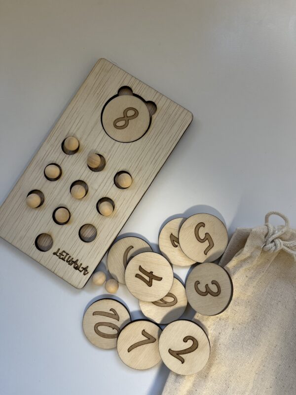 Käsitööna valmistatud puidust mäng aitab lapsel õppida numbreid 1–10 ning arendada peenmotoorikat, loogilist mõtlemist ja loendamisoskust.